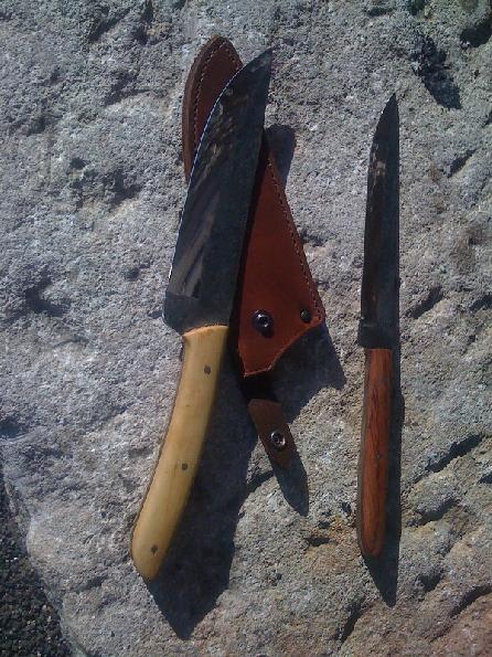 Voici les couteaux de Denis. Le couteau de cuisine avec manche le manche en buis a été baptisé "1300" (nombre approximatif de coups de marteau). L'autre couteau de cuisine dispose d'un manche en bois de rose.
